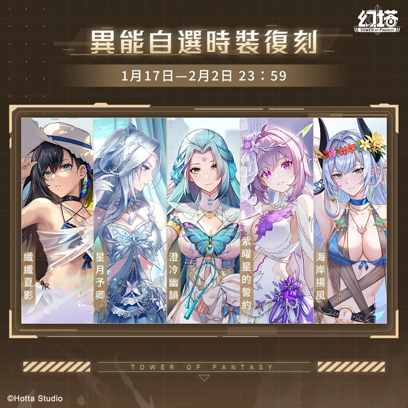 活動說明:活動期間內,將開啟5個擬態造型復刻,分別為:凜夜「纖纖夏影」 南音「澄冷幽韻」 菲歐娜「星月予卿」 裂空「紫曜星的誓約」 以及 諾菈「海岸揚風」
